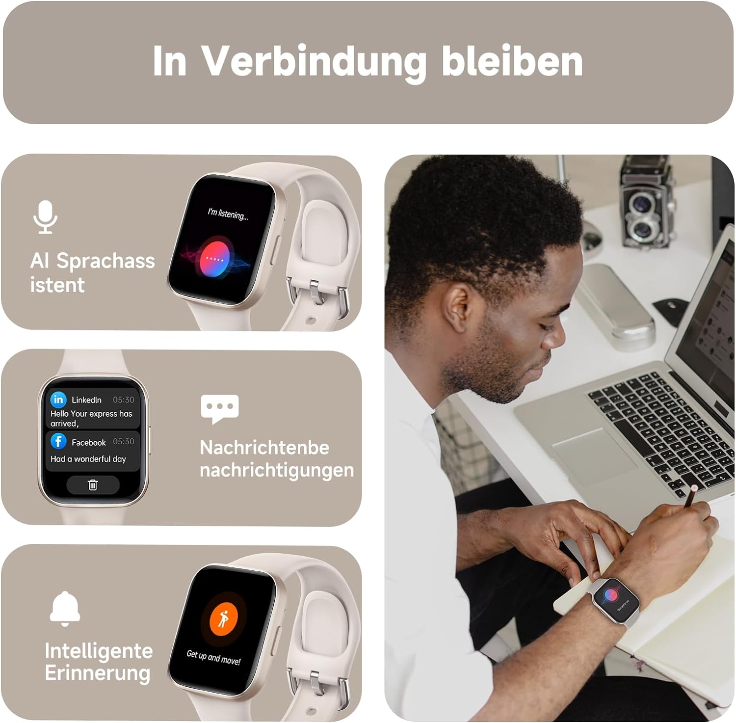 - ➤【Eine vielseitige Quelle der Praktikabilität】: Diese Smartwatch für Damen Herre ist randvoll mit praktischen Funktionen wie einem Sprachassistenten, Atemtraining, Alarmen, Musiksteuerung, Fernkamera, Handyortung, Nicht stören Modus, Taschenlampe, Menstruationszyklus-Verfolgung und Wetteraktualisierungen usw. Es wartet eine Fülle von Erkundungsmöglichkeiten auf Sie.